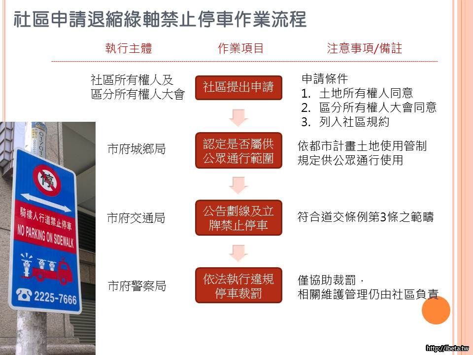 還請各位鄰居多多幫忙,在區權會裡提案、表決,表決通過以後列入規約,向城鄉局和交通局提出申請
