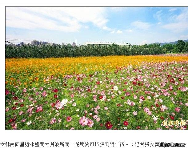 想看花海不必人擠人!樹林南園里近來盛開大片波斯菊,遍布在緊鄰北大特區的農村中,總面積高達兩公頃,花期約可持續到明年初,當地農民更貼心規劃免費停車場及景點路線,可順道一遊三合院、鳥園、有機菜園,甚至可直接向農民購買新鮮蔬菜,體驗在城市中不易見到的鄉村景致。