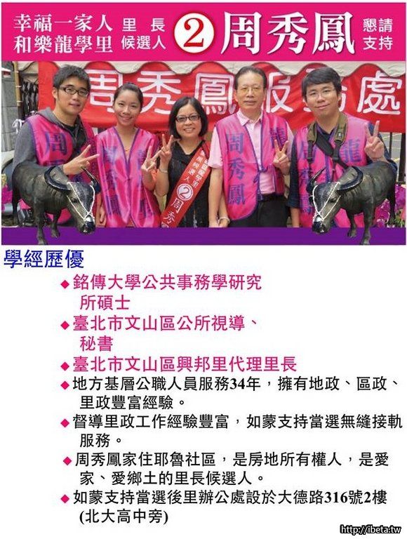 周詠青 發表於 2014-11-24 23:02 里內拜票:「里長選2號;2號周秀鳳」您的一票決定龍學里的未來。懇請支持!拜託!拜託! http://northrenti ...