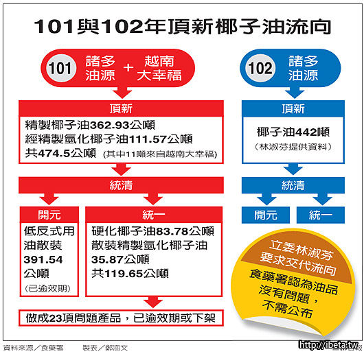 檢方證實頂新從越南大幸福進口的油品是飼料油已逾月,食藥署終於說明飼料椰油最終流向,並不是