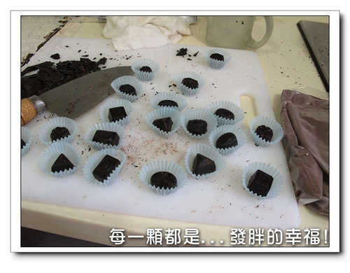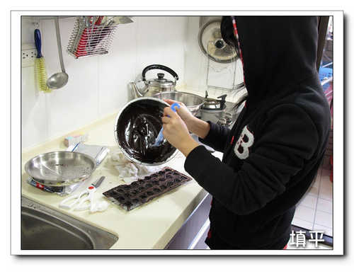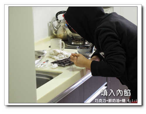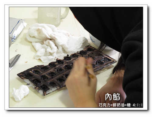 3.內餡是取部份液態巧克力,加糖跟鮮奶油,比例是4:1:1