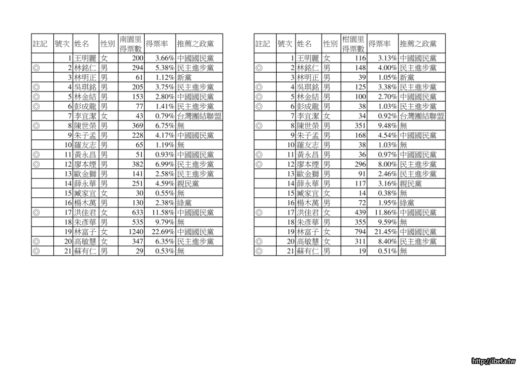 南園及柑園部份投開票所不在北大特區內但為計算方便一併加入統計.