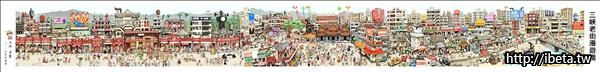 「三峽老街漫遊趣」全長六百五十公分,以如「清明上河圖」式的「長卷漫畫」繪出三峽風情,清水祖師廟、大榕樹都入畫,在地商家及地方人物也都以各自的趣味躍然紙上,仔細觀察,還有總統馬英九、前總統李登輝的身影,充滿天馬行空的想像。