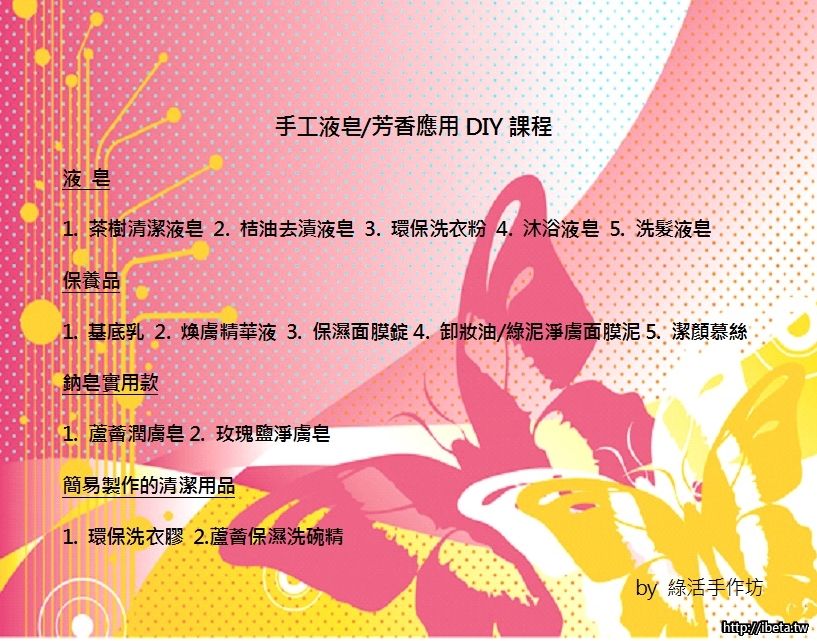 ★ 液皂課程:自104年5月9日起,每週六晚上7:00 – 9: 00,共四周