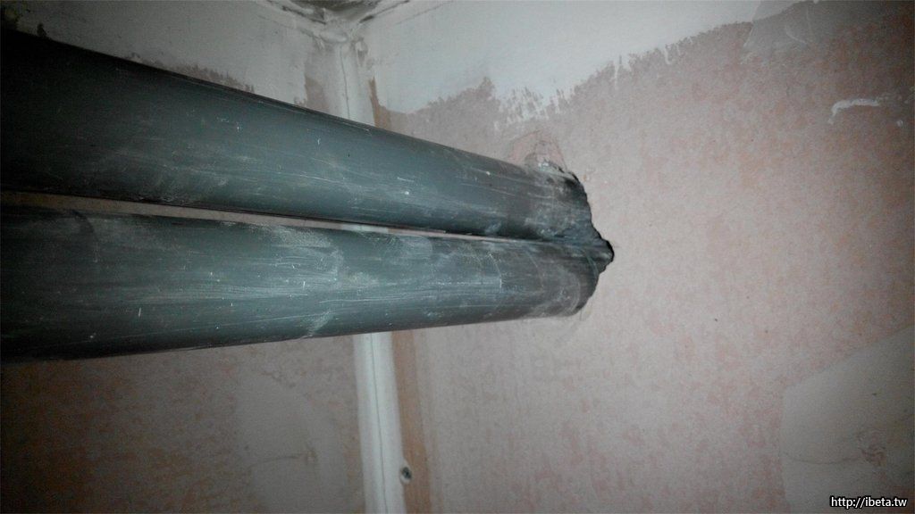 使用電鑽破壞輕隔間牆面,把水管串過去!