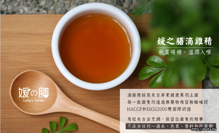 媛之膳食補膳食包括:使用屏東黑羽土雞100%無添加的滴雞精、亞洲大學研發富含60%多醣體有機栽植的我愛銀耳,以及八種精心調理的中藥食補膳食煲湯。所有產品無論是內容物或包裝材料,均經過多項高標準檢驗合格。冷凍宅配,解凍即食,全方位營養補充,方便衛生。