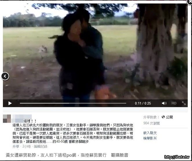 蘇姓男子(46歲)去年12月26日上午在三峽台北大學足球場晨跑,黃姓女子則在遛狗,蘇男氣其狗對他吠叫,是拿石塊丟擲,黃女不滿喝斥蘇男,蘇男一手抓住黃女脖子,更將她推倒在地,造成左肩、左手挫傷。
