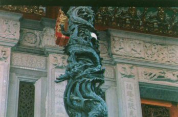 (編按:附圖(1)即為交由大陸包工製作的青平石柱,和祖師廟原有的風格蹭格不入,而顯得頗為滑稽。附圖(2)是長福橋上的模製石獅。)