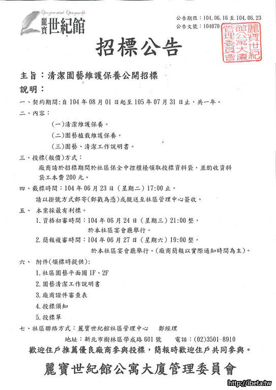 麗寶世紀館社區清潔園藝維護保養公開招標