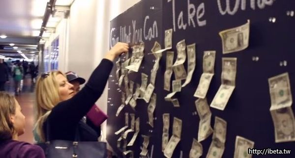 「The Toolbox」行動團隊日前推出一項街頭實驗,他們在人來人往的美國洛杉磯聯合車站內設置一面「錢牆」,上頭除了釘著一張張鈔票外,還寫著「給你能給的,拿你所需的」(Give what you can, Take what you need)標語,試驗路人們看到這項裝置會選擇「幫助」還是「接受幫助」。
