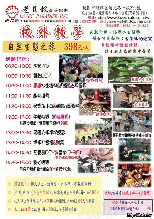西餐廳設有寬大的表演舞台及演奏型鋼琴,可供音樂發表或百人以上PARTY有提供數百人冷熱飲及COCKTAIL的吧檯。另外還有優美之花藝環境,造就豐富景觀使每位遊客親身體驗農場趣味,忘卻緊張生活締造和諧溫馨的心情。 各種票價、行程價錢、開放時間等詳細資訊,歡迎到官方網站查詢。開心的農場一日遊、桃園校外教學、桃園員工旅遊,就在老貝殼休閒農場。 老貝殼休閒農場(桃園校外教學) 地址:桃園縣龍潭鄉聖亭路八德段675巷56之7號 服務電話:(03)4890111