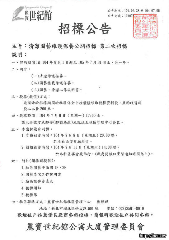 麗寶世紀館社區清潔園藝維護保養公開-第二次招標