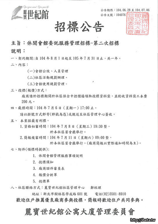 麗寶世紀館社區休閒會館委託服務管理-第二次招標