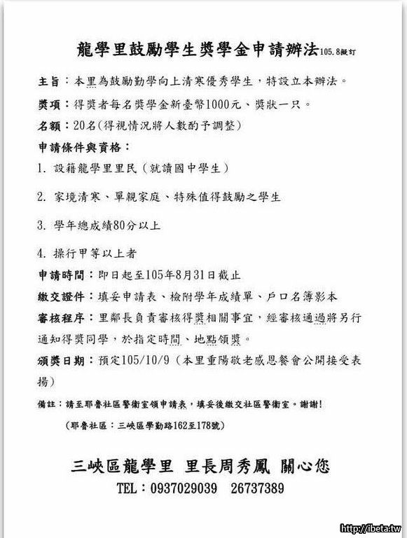 105年龍學里鼓勵學生獎學金,提醒符合條件同學,開始申請囉!