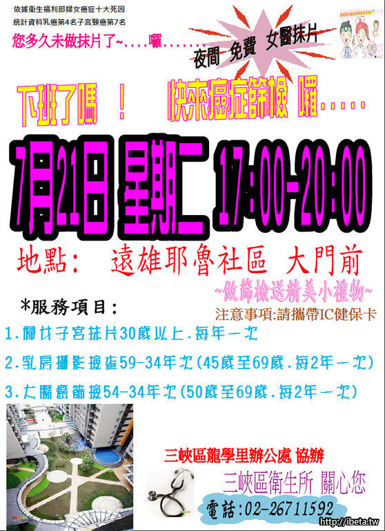 三峽衛生所7月21日夜間免費癌篩活動-遠雄耶魯社區大門前