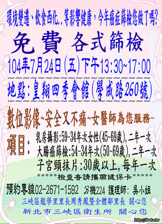 三峽衛生所7月24日癌症篩檢活動-皇翔四季會館前