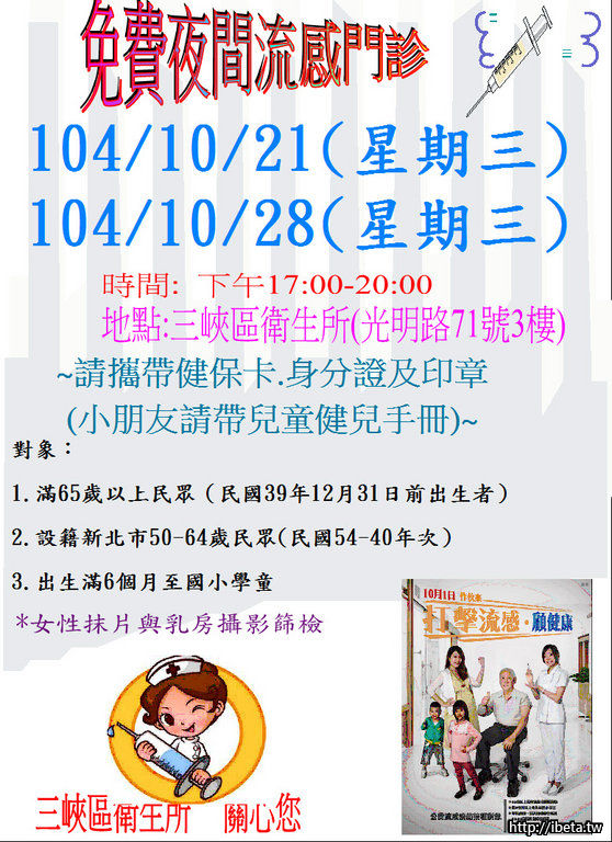 三峽衛生所10/21、10/28夜間門診