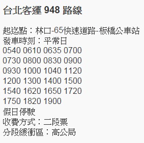 948公車是林口到板橋的通勤專車,班次少,速度快