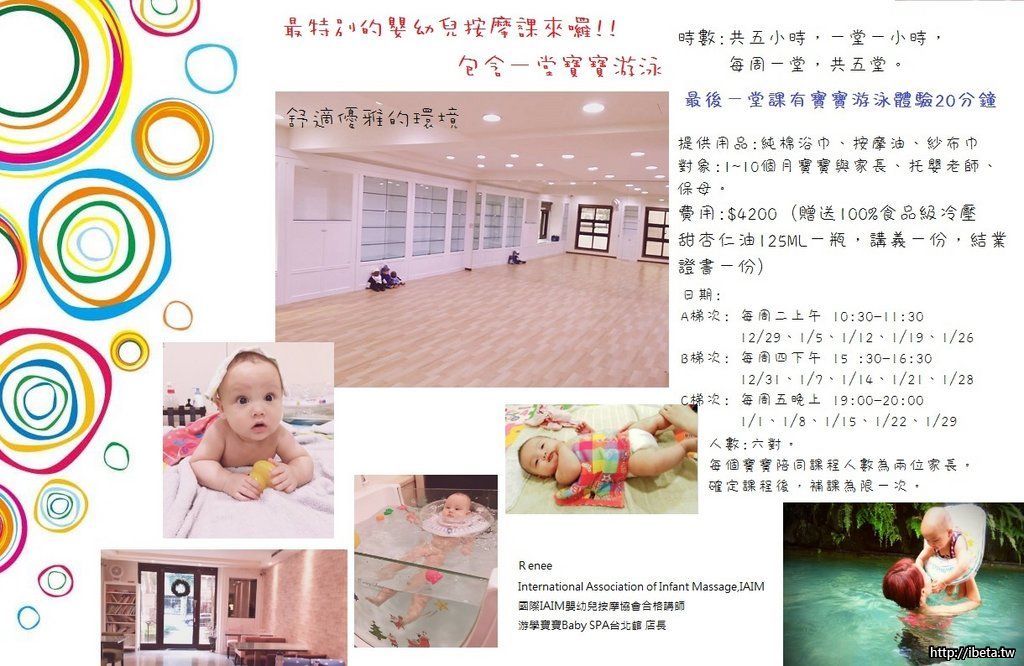 ►由游學寶寶Baby SPA台北館店長Renee親自授課,為國際IAIM嬰幼兒按摩協會合格講師,輕鬆幽默的教學風格,讓您在育兒路上更加輕鬆,且教授於您專業的國際嬰幼兒按摩手法,讓您可輕鬆在家幫寶寶按按摩,促進親子間的親密關係。