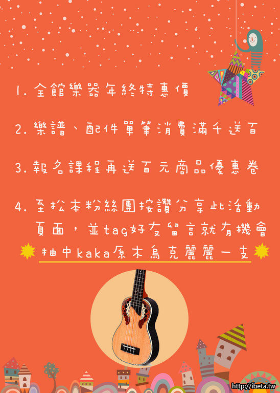 2. 在粉絲團活動頁按讚並分享到自己的臉書(權限請設公開),下方留言tag朋友:「XXX,松本樂器年終慶,抽原木烏克麗麗!」