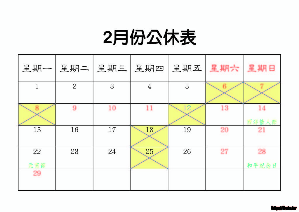 2月份的公休表