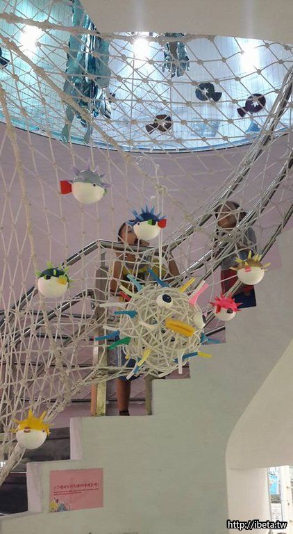 旋轉型樓梯的布置,也是細心處處....腳踩著有編號的魚兒上樓,中心環繞著各種可愛的廢物利用製作而成的魚群