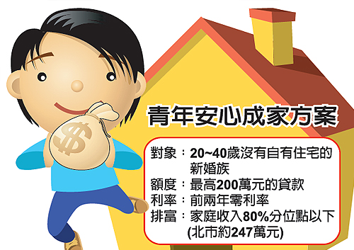 營建署表示,為減輕青年購屋負擔,今年仍決定續辦此一方案,並加碼購屋共2萬個名額,條件如同往年,提供20~40歲沒有自有住宅的新婚族,最高200萬元的貸款,前兩年為零利率,第3年如果家庭所得在50%分位點以下的,可續享低利率,其他則回到市場利率,政府不再補貼。