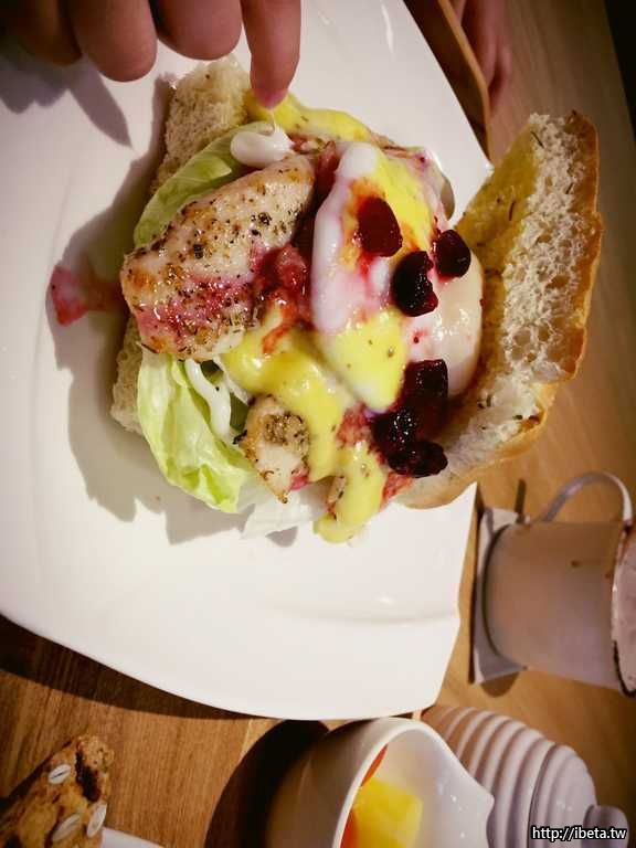 雞肉班尼克蛋,外面的麵包是佛卡夏,有花草香氣,加上蛋液跟香煎雞肉、蔬菜融合,很爽口