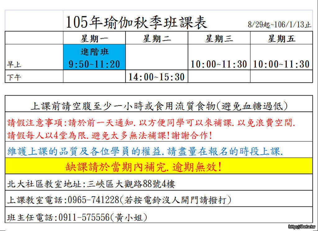 萍心瑜伽教室 發表於 2016-6-25 23:50 你好~9月份開學後(秋季班)的班要8月開始招生.請密切注意!名額限制8人(小班制). 電話:2672-4051.0917-6900 ...
