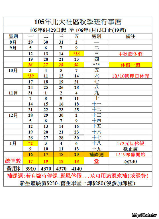 萍心瑜伽教室 發表於 2016-6-28 15:53 秋季班會在8月招生.9月開課.但是以原有的舊生先報名(舊生有優先權).有剩名額才會釋出給新進學員!敬請諒解 ...