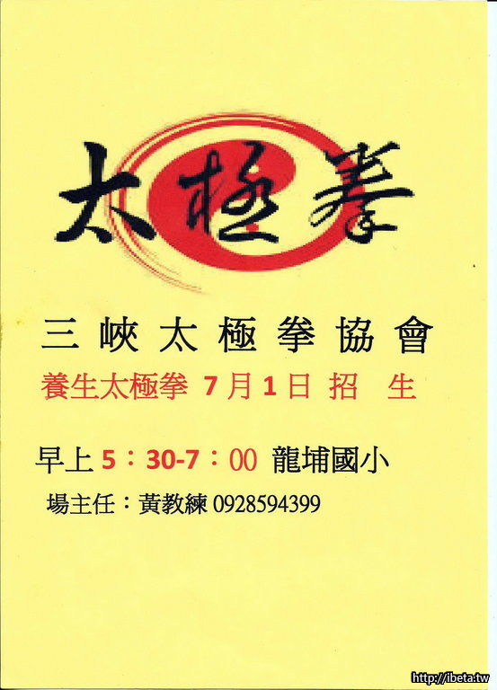 新北市三峽區太極拳協會龍埔教練場日班,即將於2016年7月1日開班,歡迎有興趣的同好一起加入學習太極拳的陣容,並請把握這次的開班良機,本場係由本協會的總教練在場傳授指導。