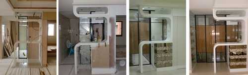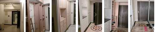 進玄關右側鞋櫃 : 這張圖只有顯示鞋櫃後半部, 包括上下櫃以及端景台, 另一半靠門口的前半部是抽拉式鞋櫃以及衣帽櫃, 因為深度超過80cm以上, 為避免浪費空間, 鞋櫃改用抽拉式的, 可以看一下上面變化圖上有稍微拉一點出來, 軌道五金件就有80cm長, 分上下二層.