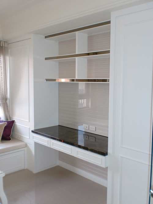 固定式書桌 : 椅子還沒買, 這書桌原本是磚牆, 書桌後面是兒子的房間, 原本鐵雄規劃的書房空間太小, 兒子的房間太大不符我們的需求, 後來設計師建議打掉磚牆, 以書桌書櫃來當隔間, 解決我們的困擾. 書桌前事先貼上跟客廳一樣的壁紙再加上清玻, 不過客廳跟其他地方是用直貼, 書桌前是用橫貼, 視覺上比較寬敞, 色系又搭的上.
