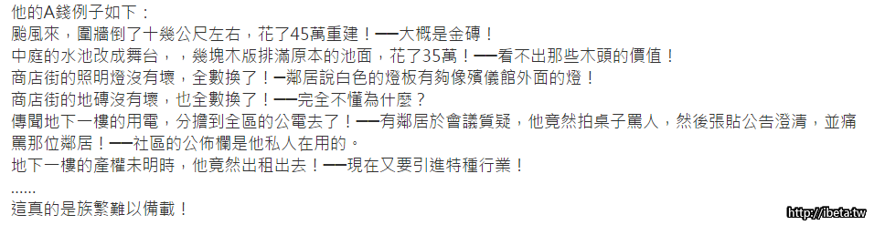 [backcolor=Yellow]近來有心人開始視公寓大廈管委會為大餅,利用組織滲透管委會,勾結管理顧問公司、社區總幹事等,收取管理費回扣,並在修繕的時候,圖利特定廠商,大汙公款。