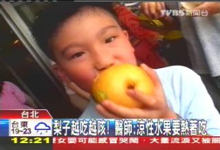 中藥書籍記載,梨子能潤肺化痰解毒,因此民間偏方,相信梨子水能治咳嗽,碰上今年冬天異常寒冷,感冒病患大增,但沒想到吃了梨子卻反而咳的更厲害,中醫師說明,因為梨子和橘子都是涼性水果,如果是咳嗽這類寒性感冒,梨子一定要燉成湯,吃熱的,如果生食只會愈吃愈糟。