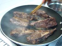 * 奶油加熱融化 放大蒜 炒到略焦後取出大蒜 然後放下羊排