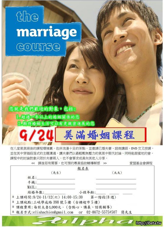敬邀參加 105/9/24(六) 起之美滿婚姻課程~婚姻保鮮秘笈 - 八堂浪漫約會