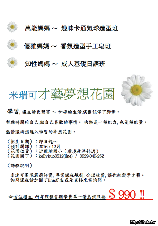 {:7_429:} 米瑞可才藝夢想花園:首期嚴選課程心動價一律$990(期)