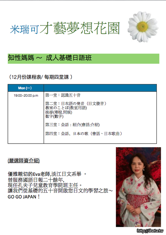 來到北大已經四年了!我們想服務在地的媽媽們來輕鬆地學習自己有興趣的才藝課程。