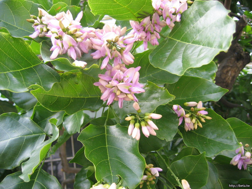 半落葉性喬木,樹冠傘形。葉為奇數羽狀複葉,互生,革質,小葉對生。花腋生,總狀花序,蝶形,淡紫色。莢果木質,長橢圓形,略呈刀狀,扁平。種子扁球形,黑色,富含油脂。
