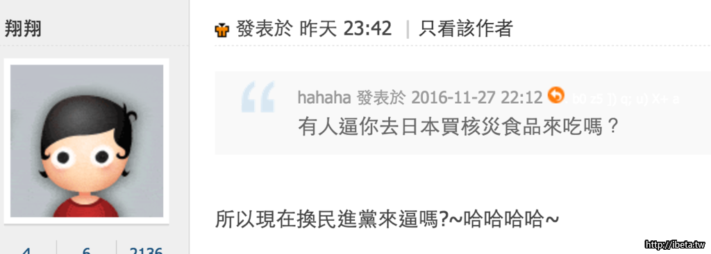 hahaha 發表於 2016-11-28 00:02 你可以貼個文來證明民進黨逼你去日本買核災食品吃嗎?