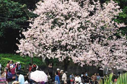 淡水無極天元宮盛開的櫻花樹下,常有近百遊客擠在樹下拍照、賞花。