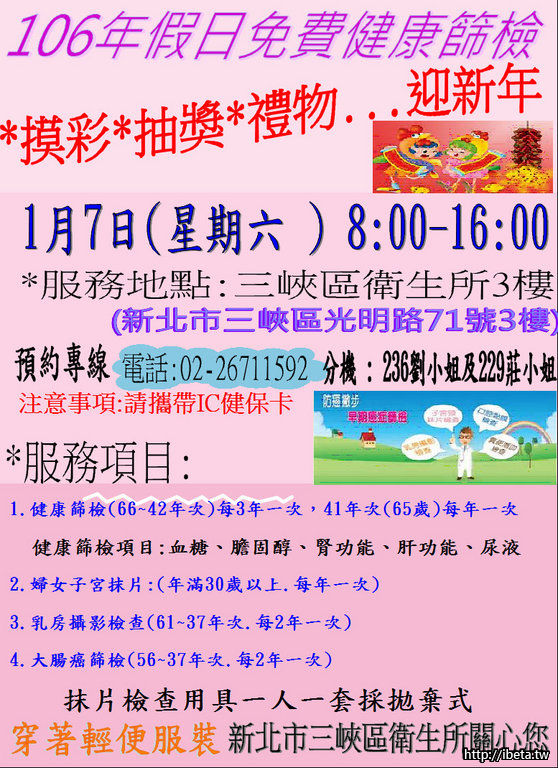 1月7日(六)三峽衛生所假日免費健康篩檢