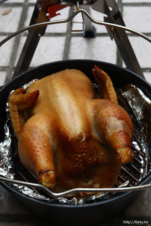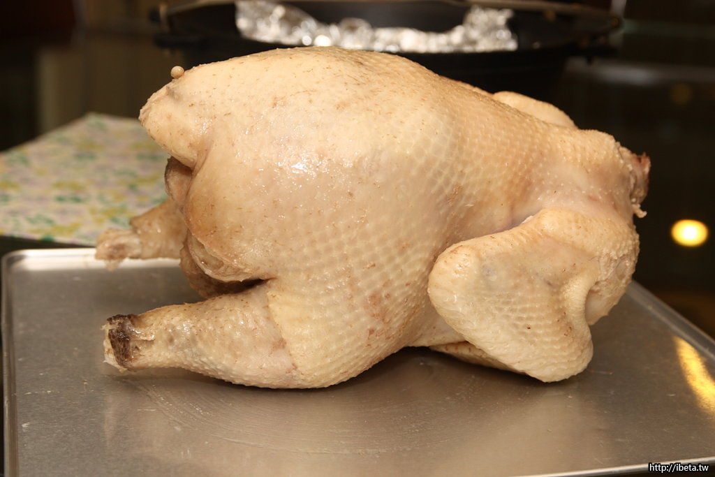 水煮八分熟的雞, 並不用烤太久, 主要是煙燻