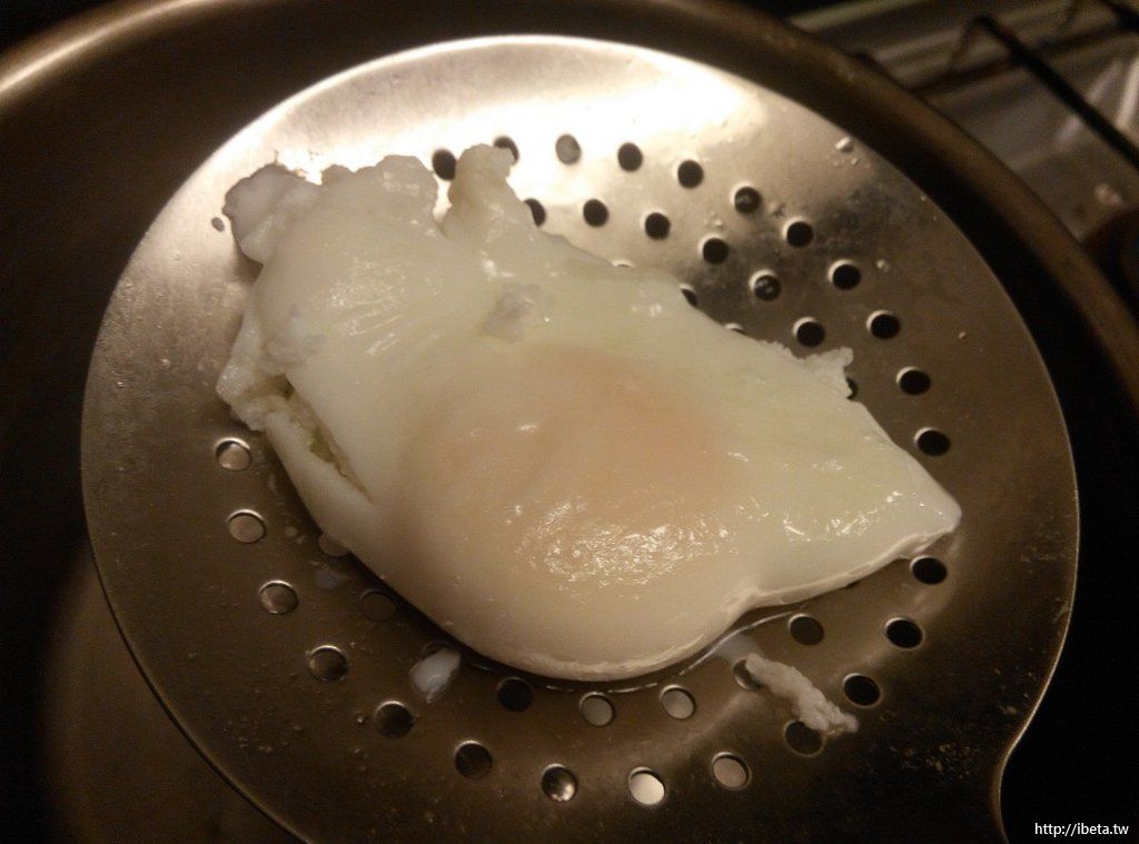 STEP 8. 記得剛泡熱水裡的『冷水泡蛋』嗎,將之撈起,就是顆完美的Poached egg水波蛋。這鍋三煮的熱水,功成身退,可以倒掉了!
