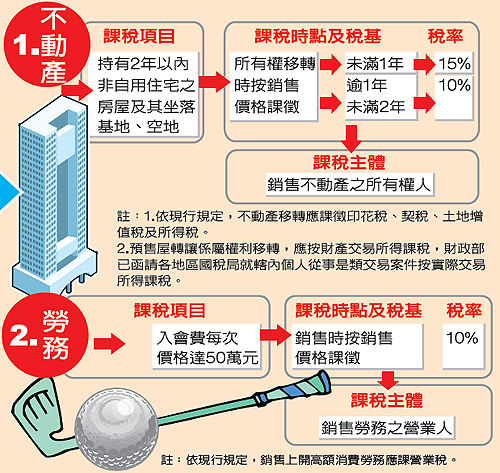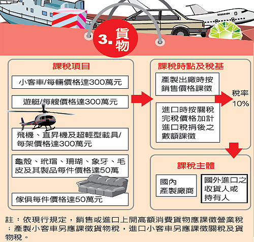 財政部針對奢侈稅的具體內容上午也首度曝光,除了持有2年內之非自用住宅及房屋及土地將課10%-15%稅率外,其他被列入課稅範圍的奢侈品除了價值300萬元以上的汽車、遊艇、私人飛機等外,還有50萬元以上的家具、龜殼、玳瑁、象牙、毛皮及其製品,另外連入會費達50萬元以上如俱樂部、高爾夫球證等高額消費,銷售時都會被課10%稅率。