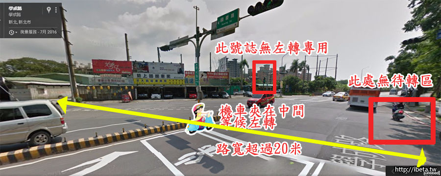 個人淺見,為什麼不把學成路往北大方向,路口機車等待區及停止線往後退至新路口,再加裝多向號誌分時控管車流,形成一個更大的路口方便各向車流行進呢?