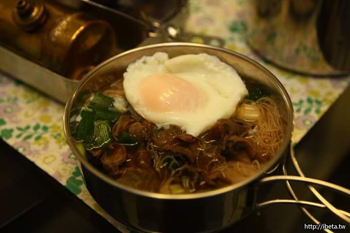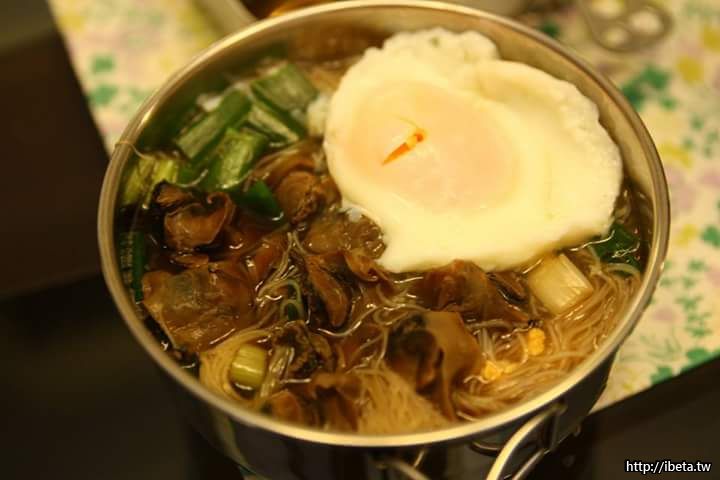 預熱放火,利用火力尚未穩定時,燒鍋水:先煮顆水波蛋,接著燙米粉,完成後撈起備用。