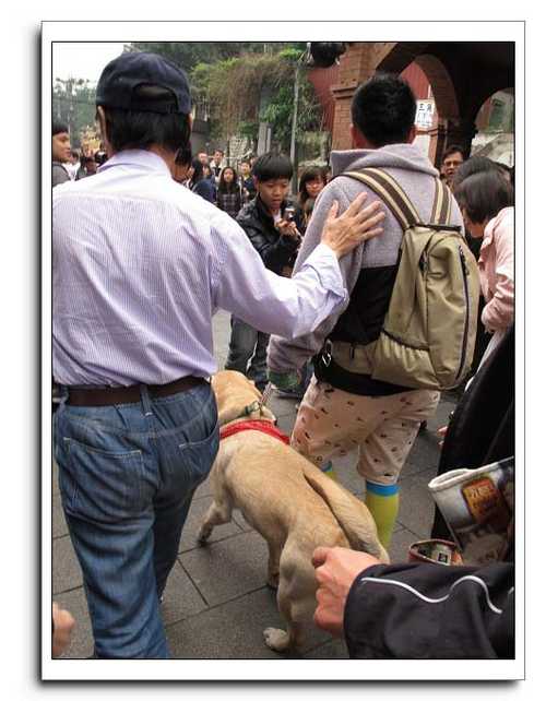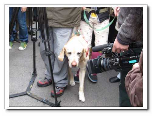 大家都拿著相機,手機,攝影機...圍著拍一個帶狗的人!