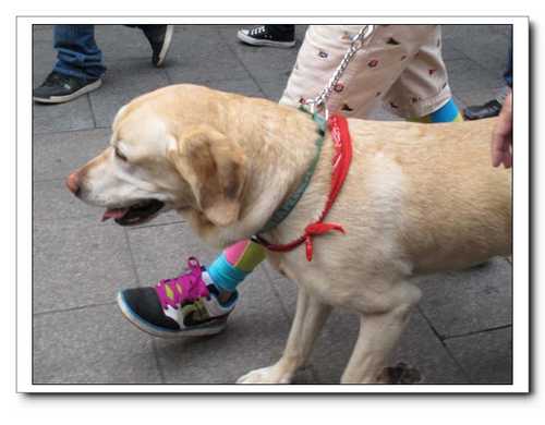 這個帶狗的人,穿著睡褲,兩腿著雙色襪,打扮實在很怪異,
